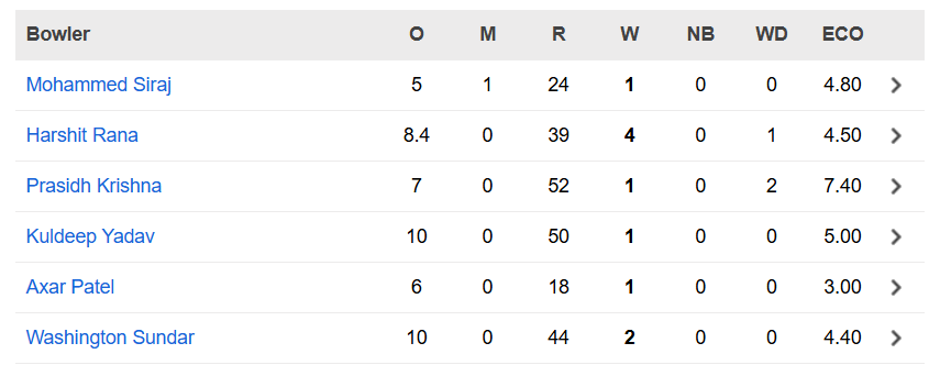 इसके बाद बात करें गेंदबाजी की भारतीय गेंदबाजों ने आखिरी मुकाबले में अच्छा प्रदर्शन किया. भारत के लिए हर्षित राणा ने सर्वाधिक 4 विकेट अपने नाम किए. इसके अलावा सुंदर ने 2, कुल्दीप और अक्षर पटेल ने 1-1 विकेट लिए और सिराज के खाते में भी एक विकेट गया.