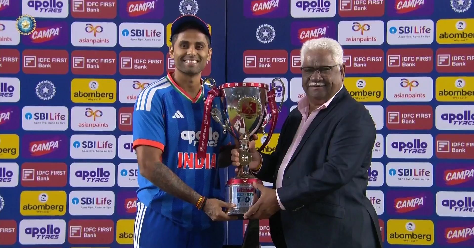 That winning feeling 🥳#TeamIndia captain Surya Kumar Yadav lifts the @IDFCFIRSTBank T20I Series Trophy 🏆 #INDvSA | @surya_14kumar pic.twitter.com/VVJAQH2B9f