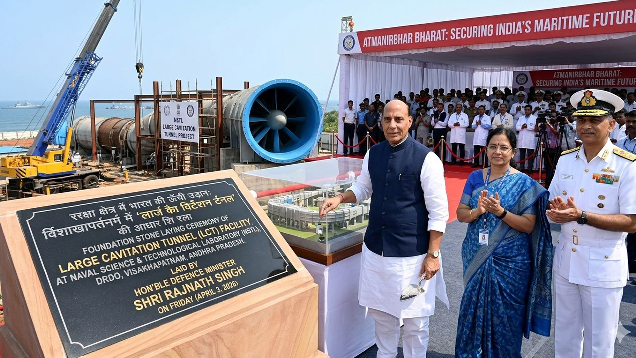 विशाखापत्तनम, 4 अप्रैल 2026: भारत की रक्षा आत्मनिर्भरता और समुद्री शक्ति को और मजबूत करने की दिशा में एक ऐतिहासिक कदम उठाते हुए, रक्षा मंत्री राजनाथ सिंह ने शुक्रवार (3 अप्रैल 2026) को विशाखापत्तनम स्थित नौसेना विज्ञान और तकनीकी प्रयोगशाला (NSTL) में एक अत्याधुनिक लार्ज कैविटेशन टनल (LCT) सुविधा की आधारशिला रखी।
