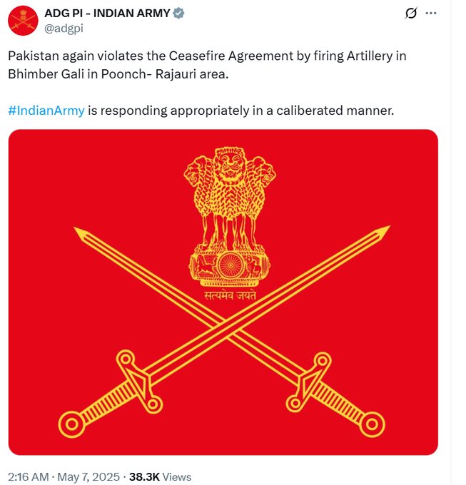 भारतीय सेना ने ट्वीट किया, “पाकिस्तान ने पुंछ-राजौरी क्षेत्र के भीमबेर गली में तोपखाने से गोलीबारी करके एक बार फिर संघर्ष विराम समझौते का उल्लंघन किया है. भारतीय सेना उचित तरीके से जवाब दे रही है.”