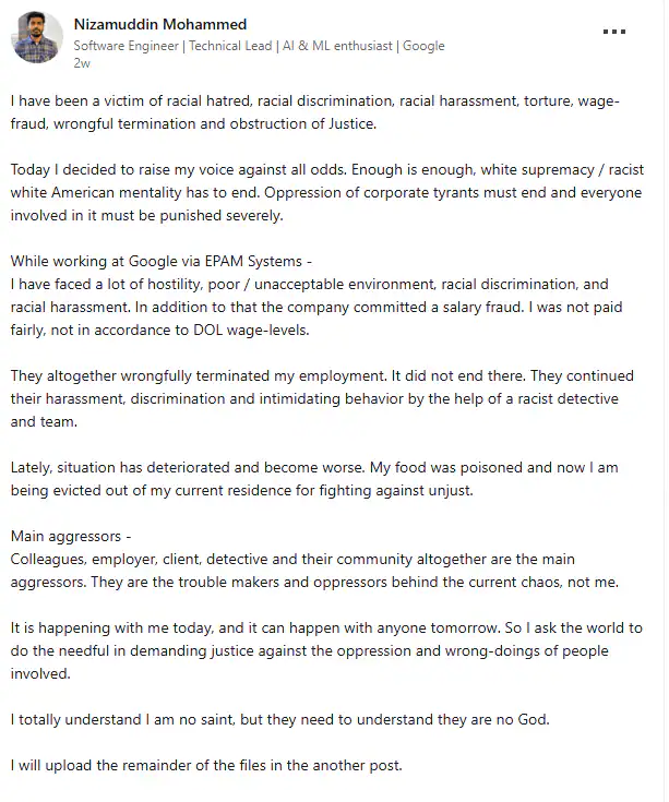 परिवार ने बताया कि गोली मारे जाने से दो हफ्ते पहले एक लिंक्डइन पोस्ट में निजामुद्दीन ने सार्वजनिक रूप से नस्लीय उत्पीड़न, वेतन में धोखाधड़ी और गलत तरीके से नौकरी से निकाले जाने की शिकायतें उठाई थीं.