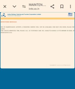 दरअसल आज आईआरसीटीसी की साइट पर जाने पर लोगों को पॉप-अप देखने को मिला जिसमें “मेंटिनेंस एक्टिविटी के ई-टिकटिंग सेवा अगले एक घंटे के लिए उपलब्ध नहीं रहेगी. कृपया बाद में प्रयास करें. कैंसलेशन/टीडीआर फाइल करने के लिए, कृपया ग्राहक सेवा नंबर 14646, 0755-6610661 और 0755-4090600 पर कॉल करें या etickets@irctc.co.in पर मेल करें” ऐसा देखने को मिला.