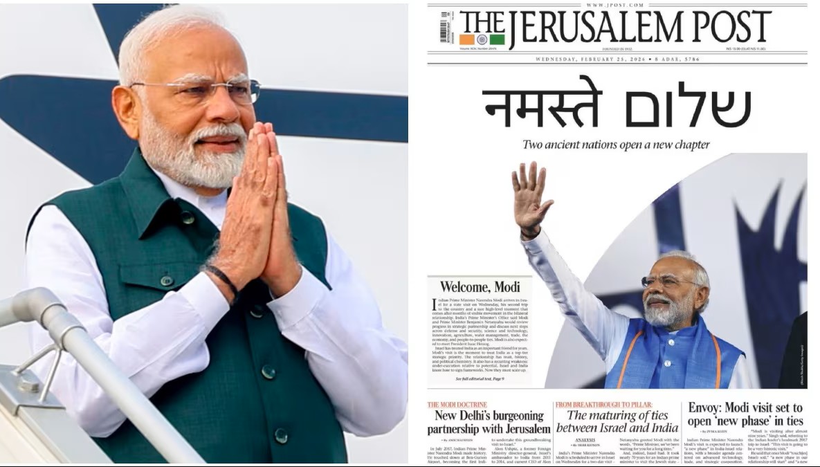 प्रधानमंत्री नरेंद्र मोदी अपनी दो दिवसीय यात्रा के लिए आज दिल्ली से इज़राइल रवाना हो चुके हैं. इस बीच उनकी तस्वीर को जेरूसलम पोस्ट पेपर ने फ्रंट पेज पर लगाया है और साथ में नमस्ते मोदी लिखा है. इज़राइल के प्रधानमंत्री बेंजामिन नेतन्याहू के बुलावे पर, प्रधानमंत्री नरेंद्र मोदी 25-26 फरवरी, 2026 को इज़राइल का राजकीय दौरा करेंगे. यह प्रधानमंत्री का इज़राइल का दूसरा दौरा होगा.