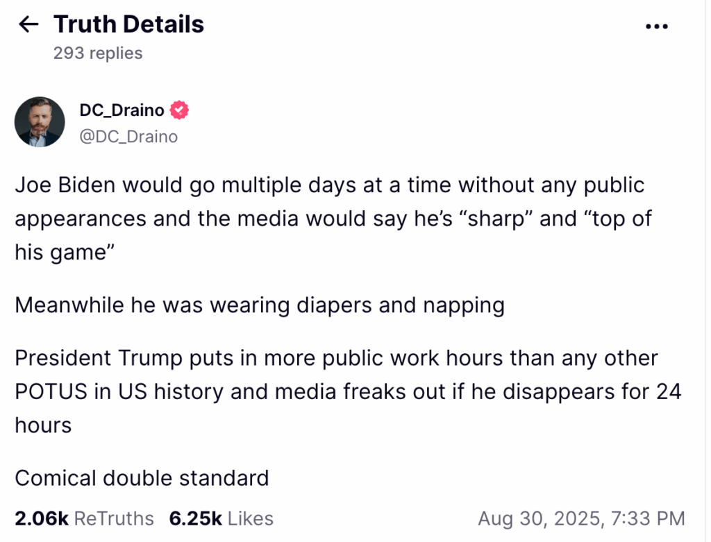 ड्रेनो ने लिखा, “जो बाइडेन कई-कई दिन बिना किसी सार्वजनिक उपस्थिति के रहते थे और मीडिया कहता था कि वह ‘तेज़’ और ‘अपने खेल में शीर्ष पर’ हैं, जबकि इस बीच, वह डायपर पहने और झपकी लेते रहते थे.”