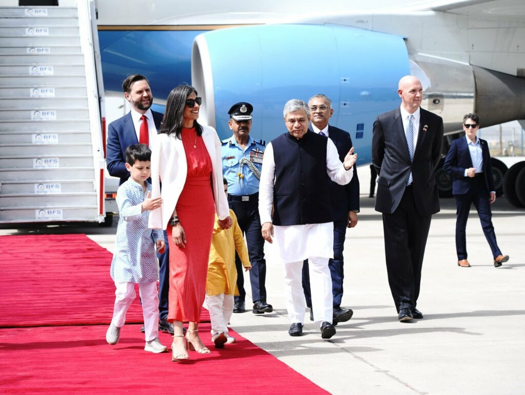 MEA Spopkesperson Randhir Jaiswal tweets, “A very warm welcome to Vice President JD Vance,Second Lady of the US Usha Vance, & the US delegation to India, received by Minister of Railways and I&B Ashwini Vaishnaw at the airport. The Official Visit (21–24 Apr) spanning Delhi,… pic.twitter.com/xQIj3HgpVb