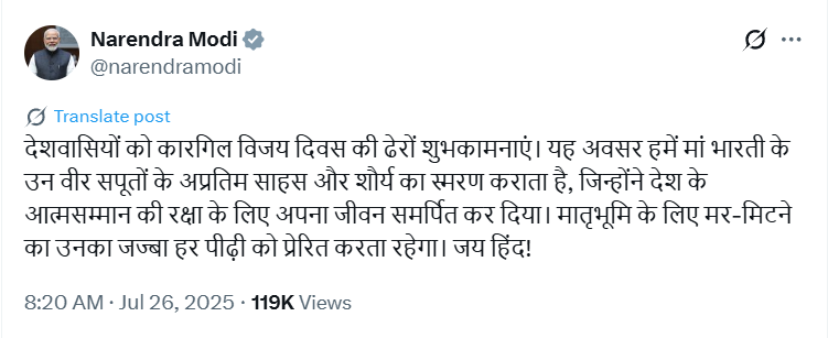 पीएम मोदी ने ट्वीट कर कहा, देशवासियों को कारगिल विजय दिवस की ढेरों शुभकामनाएं. यह अवसर हमें मां भारती के उन वीर सपूतों के अप्रतिम साहस और शौर्य का स्मरण कराता है, जिन्होंने देश के आत्मसम्मान की रक्षा के लिए अपना जीवन समर्पित कर दिया. मातृभूमि के लिए मर-मिटने का उनका जज्बा हर पीढ़ी को प्रेरित करता रहेगा. जय हिंद!