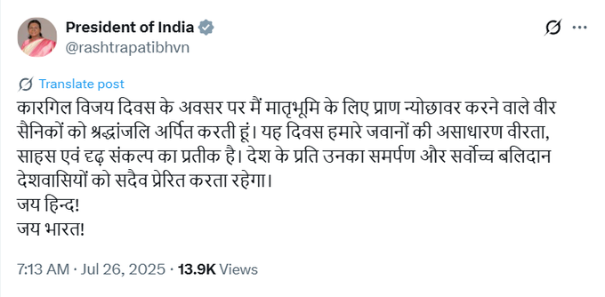 राष्ट्रपति द्रौपदी मुर्मू ने ट्वीट किया, “कारगिल विजय दिवस के अवसर पर मैं मातृभूमि के लिए प्राण न्योछावर करने वाले वीर सैनिकों को श्रद्धांजलि अर्पित करती हूं. यह दिवस हमारे जवानों की असाधारण वीरता, साहस एवं दृढ़ संकल्प का प्रतीक है. देश के प्रति उनका समर्पण और सर्वोच्च बलिदान देशवासियों को सदैव प्रेरित करता रहेगा.”