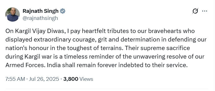 रक्षा मंत्री राजनाथ सिंह ने ट्वीट किया, “कारगिल विजय दिवस पर, मैं अपने उन वीरों को भावभीनी श्रद्धांजलि अर्पित करता हूं जिन्होंने सबसे कठिन परिस्थितियों में भी हमारे राष्ट्र के सम्मान की रक्षा में असाधारण साहस, धैर्य और दृढ़ संकल्प का परिचय दिया. कारगिल युद्ध के दौरान उनका सर्वोच्च बलिदान हमारे सशस्त्र बलों के अटूट संकल्प की एक शाश्वत याद दिलाता है. भारत उनकी सेवा का सदैव ऋणी रहेगा.”