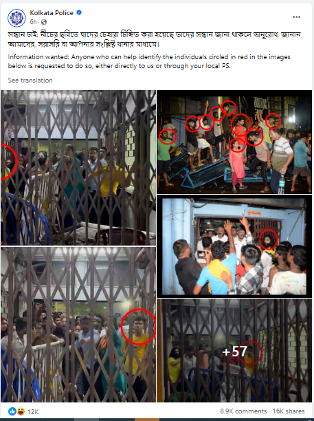 इसके बाद कोलकाता पुलिस ने सोशल मीडिया पर दंगाइयों के चेहरों के साथ तस्वीरें शेयर (Rioters’ Pics) करते हुए लोगों से उनके बारे में जानकारी मांगी है, ताकि उनकी पहचान की जा सके। बता दें कि दंगाइयों न सिर्फ अस्पताल में जमकर उत्पात मचाया बल्कि स्वास्थ्य व्यवस्थाओं को तहस-नहस कर दिया।
