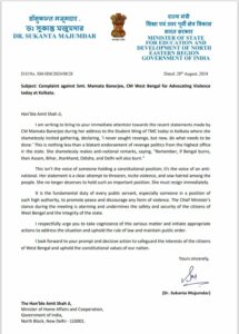 सीएम ममता बनर्जी के धमकी भरे बयान के चलते आज केंद्रीय मंत्री और पश्चिम बंगाल भाजपा अध्यक्ष सुकांता मजूमदार ने केंद्रीय गृह मंत्री अमित शाह को पत्र में लिखा, “मैं आपका ध्यान हाल ही में कोलकाता में टीएमसी की छात्र शाखा को संबोधित करते हुए मुख्यमंत्री ममता बनर्जी द्वारा दिए गए बयानों की ओर आकर्षित करना चाहता हूँ, जहाँ उन्होंने बेशर्मी से लोगों को उकसाते हुए कहा ‘मैंने कभी बदला नहीं लिया, लेकिन अब जो करना है, वो करूँगी.’ यह राज्य के सर्वोच्च पद से बदले की राजनीति का खुला समर्थन है… मैं पश्चिम बंगाल के नागरिकों के हितों की रक्षा करने और हमारे राष्ट्र के संवैधानिक मूल्यों को बनाए रखने के लिए आपकी त्वरित और निर्णायक कार्रवाई की आशा करता हूँ.”