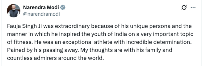 प्रधानमंत्री नरेंद्र मोदी ने ट्वीट कर फ़ौजा सिंह जी को श्रद्धांजलि अर्पित की, उन्होंने लिखा, फ़ौजा सिंह जी अपने अद्वितीय व्यक्तित्व और फिटनेस जैसे महत्वपूर्ण विषय पर भारत के युवाओं को प्रेरित करने के अपने तरीके के कारण असाधारण थे. वे अद्भुत दृढ़ संकल्प वाले एक असाधारण एथलीट थे. उनके निधन से बहुत दुःख हुआ. मेरी संवेदनाएँ उनके परिवार और दुनिया भर में उनके अनगिनत प्रशंसकों के साथ हैं.