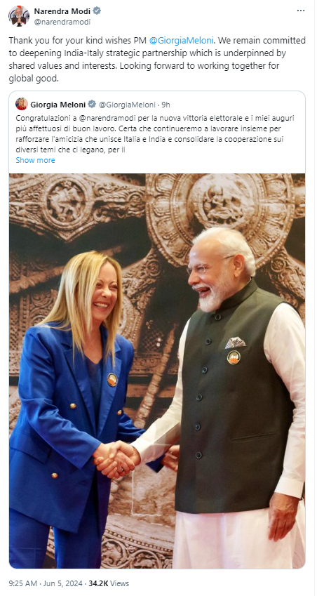 इटली के प्रधानमंत्री जॉर्जिया मेलोनी ने पीएम मोदी को बधाई दी और कहा कि भारत और इटली की दोस्ती को मजबूत करने के लिए दोनों देश मिलकर काम करते रहेंगे. मेलोनी ने ट्वीट किया, ”नरेंद्र मोदी को नई चुनावी जीत पर बधाई और अच्छे काम के लिए मेरी हार्दिक शुभकामनाएं. निश्चित है कि हम इटली और भारत को एकजुट करने वाली दोस्ती को मजबूत करने और हमारे राष्ट्रों और हमारे लोगों की भलाई के लिए हमें जोड़ने वाले विभिन्न मुद्दों पर सहयोग को मजबूत करने के लिए मिलकर काम करना जारी रखेंगे.”