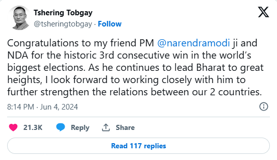 भूटान के पीएम शेरिंग टोबगे ने एक ट्वीट में पीएम मोदी को बधाई दी और कहा कि वह द्विपक्षीय संबंधों को बढ़ावा देने के लिए उनके साथ मिलकर काम करने के लिए उत्सुक हैं. उन्होंने भारत को नई ऊंचाइयों पर ले जाने के निरंतर प्रयासों के लिए मोदी की सराहना भी की. पीएम मोदी ने अपने भूटानी समकक्ष को धन्यवाद दिया और कहा, “भारत-भूटान संबंध लगातार मजबूत होते रहेंगे.”