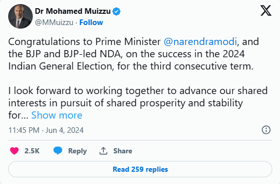 मालदीव के राष्ट्रपति मोहम्मद मुइज्जू ने कहा कि वह “हमारे दोनों देशों के लिए साझा समृद्धि और स्थिरता की खोज में हमारे साझा हितों को आगे बढ़ाने के लिए मिलकर काम करने” के लिए तत्पर हैं. मुइज्जू ने ट्वीट किया, “2024 के भारतीय आम चुनाव में लगातार तीसरी बार सफलता के लिए प्रधानमंत्री नरेंद्र मोदी और भाजपा और भाजपा के नेतृत्व वाले एनडीए को बधाई. मैं हमारे दोनों देशों के लिए साझा समृद्धि और स्थिरता की खोज में हमारे साझा हितों को आगे बढ़ाने के लिए मिलकर काम करने को उत्सुक हूं.”