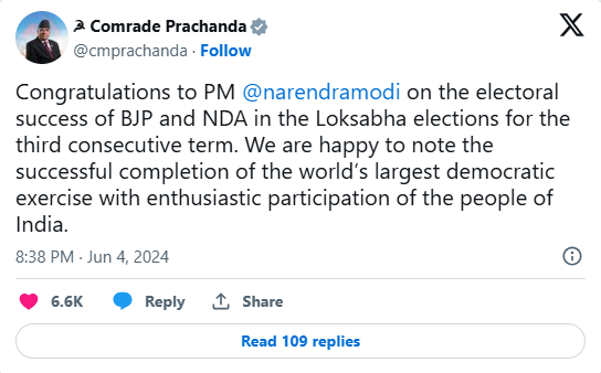 नेपाल के पीएम पुष्प कमल दहल प्रचंड ने भी प्रधानमंत्री को लगातार तीसरा कार्यकाल हासिल करने के लिए बधाई दी. प्रचंड ने एक ट्वीट में लिखा, ”लोकसभा चुनाव में बीजेपी और एनडीए की लगातार तीसरी बार चुनावी सफलता पर पीएम नरेंद्र मोदी को बधाई. हम भारत के लोगों की उत्साही भागीदारी के साथ दुनिया के सबसे बड़े लोकतांत्रिक अभ्यास के सफल समापन को देखकर खुश हैं. पीएम मोदी ने अपने नेपाली समकक्ष को जवाब दिया और कहा कि वह भारत-नेपाल मित्रता को मजबूत करने के लिए निरंतर सहयोग के लिए तत्पर हैं.