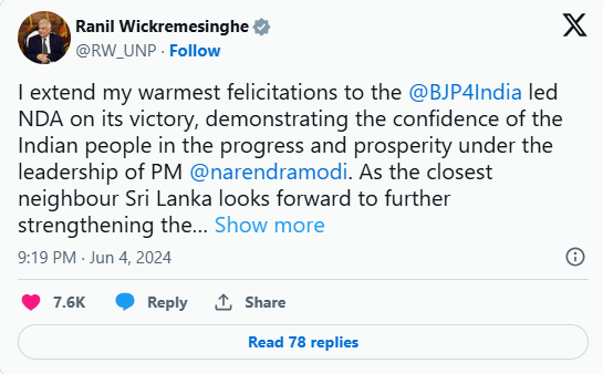 श्रीलंका के राष्ट्रपति रानिल विक्रमसिंघे ने पीएम मोदी को बधाई दी और कहा कि निकटतम पड़ोसी होने के नाते उनका देश भारत के साथ संबंधों को मजबूत करने के लिए तत्पर है. एक ट्वीट में विक्रमसिंघे ने लिखा, “मैं पीएम नरेंद्र मोदी के नेतृत्व में प्रगति और समृद्धि में भारतीय लोगों के विश्वास को प्रदर्शित करते हुए @बीजेपी4इंडिया के नेतृत्व वाली एनडीए को उसकी जीत पर हार्दिक शुभकामनाएं देता हूं. निकटतम पड़ोसी के रूप में श्रीलंका भारत के साथ साझेदारी को और मजबूत करने के लिए तत्पर है.” जवाब में पीएम मोदी ने विक्रमसिंघे से कहा कि चूंकि भारत-श्रीलंका साझेदारी नई सीमाएं तय कर रही है, इसलिए वह उनके निरंतर समर्थन के लिए तत्पर हैं.