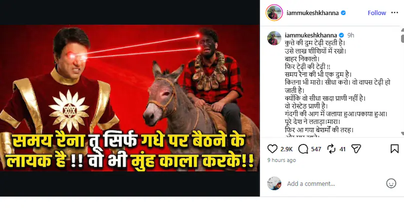 इस पर प्रतिक्रिया देते हुए मुकेश खन्ना ने एक एडिटेड तस्वीर शेयर की, जिसमें समय रैना को लेकर आपत्तिजनक टिप्पणी की गई। उन्होंने पोस्ट के कैप्शन में भी कड़े शब्दों का इस्तेमाल करते हुए समय पर निशाना साधा और उनके व्यवहार की आलोचना की।