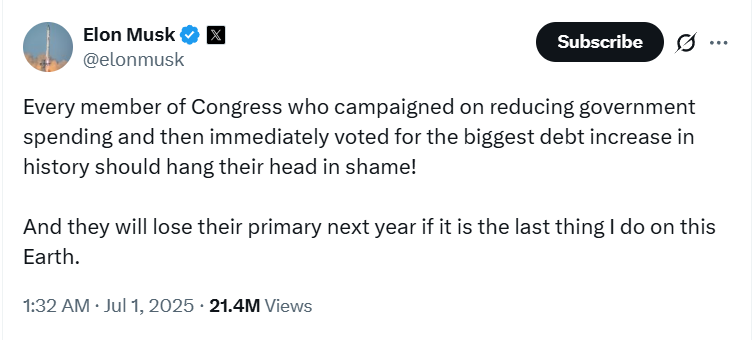 मस्क ने राष्ट्रीय घाटे को बढ़ाने और टेस्ला के लिए महत्वपूर्ण ईवी टैक्स क्रेडिट में कटौती करने के लिए ट्रंप के “वन बिग ब्यूटीफुल बिल” की आलोचना की. एलन मस्क ने इस बिल का तीखा विरोध करते हुए सोशल मीडिया प्लेटफॉर्म X पर लिखा, ‘हर वो सांसद जो खर्च कम करने की बात करता है और फिर इस ऐतिहासिक कर्ज बढ़ाने वाले बिल के पक्ष में वोट देता है, उसे शर्म आनी चाहिए.’