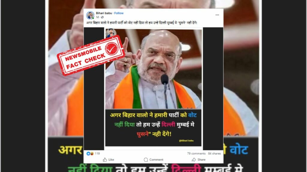 सोशल मीडिया पर गृह मंत्री अमित शाह की तस्वीर के साथ एक पोस्ट तेजी से वायरल हो रहा है। पोस्ट में तस्वीर के साथ हिंदी भाषा में लिखा गया है कि “अगर बिहार वालो ने हमारी पार्टी को वोट नहीं दिया तो हम उन्हें दिल्ली मुम्बई मे “घुसने” नही देंगे ! गृह मंत्री अमित शाह” इसी तस्वीर को हालिया दिनों में बिहार चुनाव से जोड़कर शेयर किया जा रहा है… पूरी खबर पढ़ें