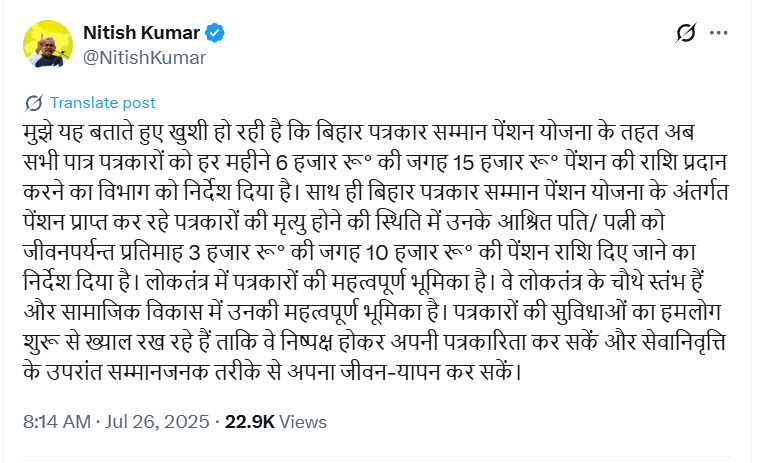 बिहार सरकार ने राज्य के पत्रकारों के लिए बड़ी राहत वाली घोषणा की है. अब पत्रकार सम्मान पेंशन योजना के तहत मिलने वाली मासिक पेंशन की राशि 6 हजार रुपए से बढ़ाकर 15 हजार रुपए कर दी गई है. मुख्यमंत्री नीतीश कुमार ने खुद इसकी जानकारी सोशल मीडिया प्लेटफॉर्म X (पहले ट्विटर) पर एक पोस्ट शेयर करके दी.