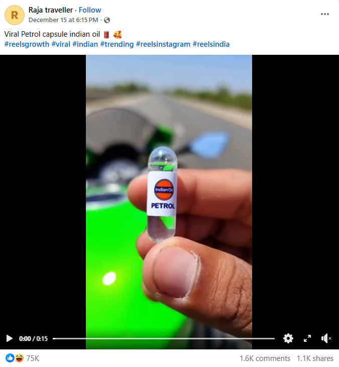 Facebook पर यूजर ने वीडियो पोस्ट करते हुए लिखा, “Viral Petrol Capsule Indian Oil” यूजर ने यह वीडियो दिसंबर 15, 2025 को पोस्ट किया है.