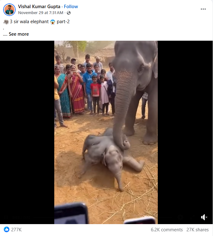 Facebook पर यूजर ने वीडियो पोस्ट करते हुए लिखा, “3 sir wala elephant” यूजर ने यह वीडियो नवंबर 2025 को पोस्ट किया है.