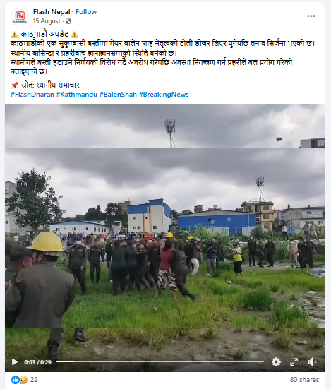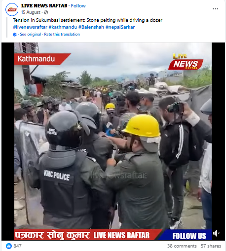 उपरोक्त मिले फेसबुक पोस्ट से यह पता चला कि वायरल वीडियो वाली घटना भारत की नहीं बल्कि नेपाल की है। इसलिए पुष्टि के लिए हमने गूगल पर बारीकी से खोजना शुरू किया। खोज के दौरान हमें वायरल वीडियो ‘Live news raftaar’ नामक फेसबुक पेज मिला जिसे अगस्त 15, 2025 को अपलोड किया गया था। प्राप्त जानकारी के मुताबिक वीडियो नेपाल में हुई एक घटना का है, जहां एक झुग्गी में बुलडोजर चलाने के बाद लोगों ने पथराव किया था। यह वीडियो उसी घटना का है।