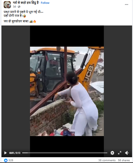 फेसबुक पर शेयर कर हिंदी भाषा के कैप्शन में लिखा गया है कि ” पत्थर मारने से पहले ये भूल गई थी—यहाँ योगी राज है। जय हो बुलडोज़र बाबा”