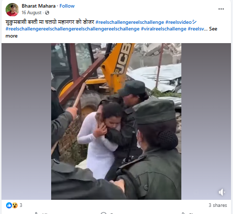 सोशल मीडिया पर एक वीडियो तेजी से वायरल हो रहा है, वीडियो में एक महिल एक बुलडोज़र पर पत्थर फेंकते हुए नजर आ रही हैं, जिसके बाद कुछ काली वर्दी पहने हुए कर्मियों को महिला को पकड़कर पीछे खेंचते हुए व उसपर जोर-जबरदस्ती कर दबिश करते हुए देखा जा सकता है। इसी वीडियो को इंटेरटनेट पर शेयर कर दावा किया जा रहा है कि वीडियो उत्तर प्रदेश का है, जहाँ योगी आदित्यनाथ की सरकार है।