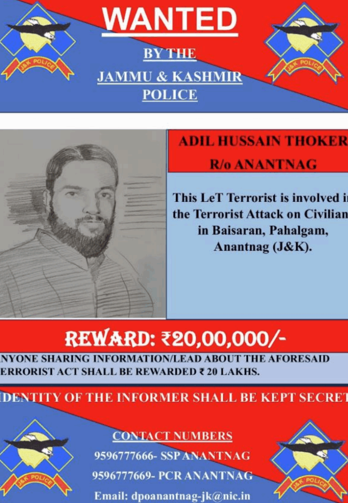 बता दें कि जम्मू-कश्मीर के अनंतनाग जिले के बिजबेहरा ब्लॉक के गुरी गांव का निवासी आदिल गुरी उर्फ आदिल थोकर पहलगाम हमले में शामिल था. इन आतंकियों को मोस्ट वांटेड घोषित किया गया है और अनंतनाग पुलिस ने इनके बारे में किसी भी जानकारी के लिए बीस लाख रुपये का इनाम घोषित किया हुआ है. वहीं पुलवामा जिले के त्राल का निवासी शेख इस हमले की साजिश में शामिल होने का संदेह है.
