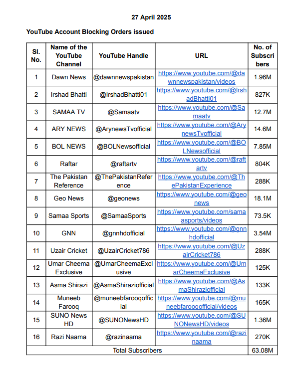 गृह मंत्रालय की सिफारिशों पर भारत सरकार ने जम्मू-कश्मीर में दुखद पहलगाम आतंकवादी घटना की पृष्ठभूमि में भारत, उसकी सेना और सुरक्षा एजेंसियों के खिलाफ भड़काऊ और सांप्रदायिक रूप से संवेदनशील सामग्री, झूठे और भ्रामक बयान और गलत सूचना प्रसारित करने के लिए डॉन न्यूज, समा टीवी, जियो न्यूज सहित 16 पाकिस्तानी यूट्यूब चैनलों पर प्रतिबंध लगा दिया है: सरकारी सूत्र