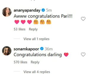 वहीं जैसे ही इस परिणीति और राघव ने प्रेग्नेंसी की अनाउंसमेंट की वैसे ही उनके प्रशंसकों और तमाम सेलेब्स ने उनकी पोस्ट के कमेंट सेक्शन में बधाई देनी शुरू कर दी है. कपल को इस गुड न्यूज के लिए मुबारकबाद देते हुए सोनम कपूर ने लिखा, “बधाई हो डार्लिंग,” वहीं अनन्या पांडे ने लिखा, “ओह बधाई परी.”इनके अलावा भी कई और सेलेब्स ने जोड़े को बधाई दी है.