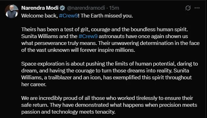 PM Modi का स्वागत संदेश, सुनीता विलियम्स की वापसी पर किया पोस्ट