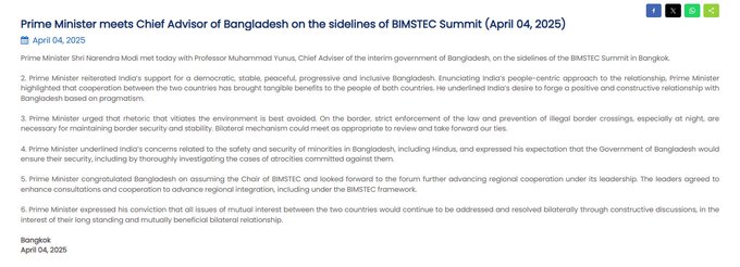 #WATCH | प्रधानमंत्री नरेंद्र मोदी और बांग्लादेश के मुख्य सलाहकार मोहम्मद यूनुस ने थाईलैंड के बैंकॉक में बैठक की। pic.twitter.com/n0TU80BCEb