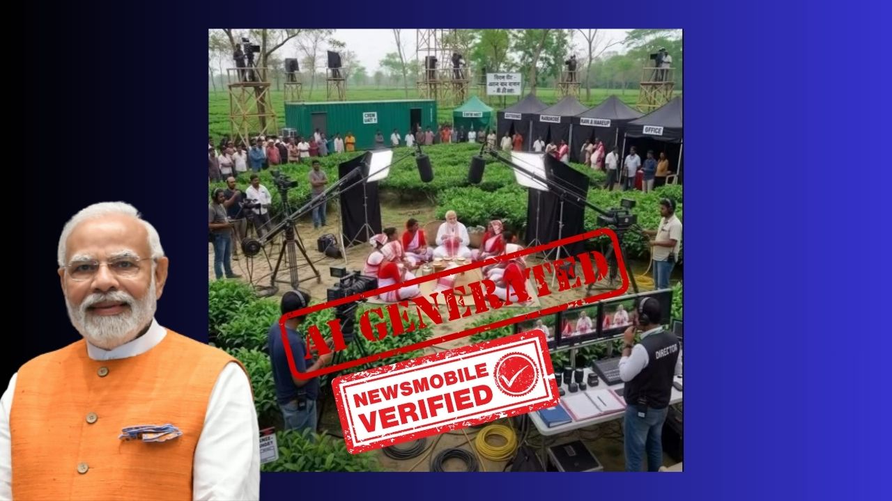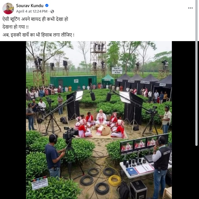 सोशल मीडिया पर इन दिनों एक वीडियो और तस्वीर तेजी से वायरल हो रही है, जिसमें दावा किया जा रहा है कि प्रधानमंत्री नरेंद्र मोदी असम के चाय बागान मजदूरों के साथ एक बड़े कैमरा सेटअप और लाइट्स के बीच बैठे हैं। इसे उनकी हालिया डिब्रूगढ़ यात्रा (1 अप्रैल 2026) से जोड़कर शेयर किया जा रहा है और कहा जा रहा है कि यह एक ‘स्टेज्ड शूट’ था।