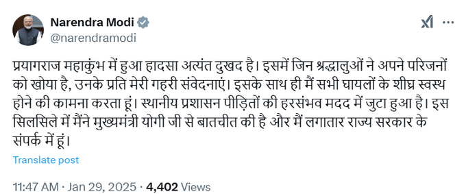महाकुंभ में भगदड़ पर प्रधानमंत्री मोदी ने कहा, “प्रयागराज महाकुंभ में जो हादसा हुआ, वह बेहद दुखद है. इसमें जिन श्रद्धालुओं ने अपने प्रियजनों को खोया है, उनके प्रति मेरी गहरी संवेदना है. इसके साथ ही मैं सभी घायलों के शीघ्र स्वस्थ होने की कामना करता हूं. स्थानीय प्रशासन पीड़ितों की हरसंभव मदद करने में लगा हुआ है. इस संबंध में मैंने मुख्यमंत्री योगी जी से बात की है और मैं लगातार राज्य सरकार के संपर्क में हूं.”