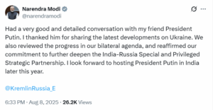 इसी के साथ प्रधानमंत्री नरेंद्र मोदी ने ट्वीट कर लिखा, “मेरे मित्र राष्ट्रपति पुतिन के साथ बहुत अच्छी और विस्तृत बातचीत हुई. मैंने यूक्रेन पर नवीनतम घटनाक्रम साझा करने के लिए उनका धन्यवाद किया. हमने अपने द्विपक्षीय एजेंडे में प्रगति की भी समीक्षा की और भारत-रूस विशेष एवं विशेषाधिकार प्राप्त रणनीतिक साझेदारी को और गहरा करने की अपनी प्रतिबद्धता दोहराई. मैं इस वर्ष के अंत में भारत में राष्ट्रपति पुतिन की मेज़बानी करने के लिए उत्सुक हूँ.”