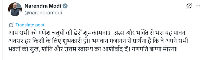 X पर एक पोस्ट में, प्रधानमंत्री मोदी ने इस पावन अवसर पर सभी की खुशहाली और समृद्धि की कामना की. प्रधानमंत्री ने लिखा, “आप सभी को गणेश चतुर्थी की हार्दिक शुभकामनाएँ. भक्ति और आस्था से परिपूर्ण यह पावन अवसर सभी के लिए मंगलमय हो. मैं भगवान गजानन से प्रार्थना करता हूँ कि वे अपने सभी भक्तों को सुख, शांति और उत्तम स्वास्थ्य प्रदान करें. गणपति बप्पा मोरया!”
