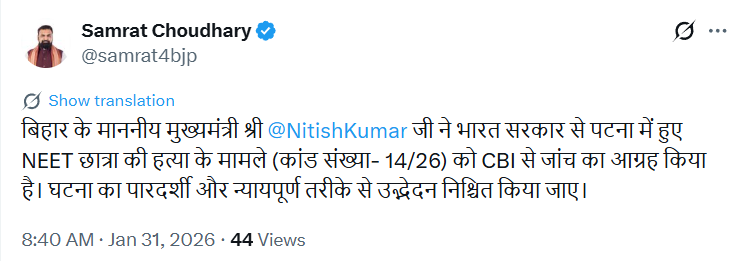 पटनाः NEET छात्रा के साथ कथित रेप और उसके बाद हुई संदिग्ध मौत ने पूरे बिहार को झकझोर कर रख दिया था. वहीं आज इस मामले में बड़ा अपडेट सामने आया है. डिप्टी सीएम सम्राट चौधरी ने सीबीआई जांच का आग्रह किया है. डिप्टी सीएम सम्राट चौधरी ने अपने एक्स पोस्ट में लिखा कि- “बिहार के माननीय मुख्यमंत्री नीतीश कुमार ने भारत सरकार से पटना में हुए NEET छात्रा की हत्या के मामले (कांड संख्या-14/26) की CBI से जांच कराने का आग्रह किया है. उन्होंने कहा कि इस जघन्य घटना का उद्भेदन पूरी तरह पारदर्शी और न्यायपूर्ण तरीके से होना चाहिए, ताकि पीड़ित परिवार को न्याय मिल सके और दोषियों को कड़ी सजा दी जा सके.”