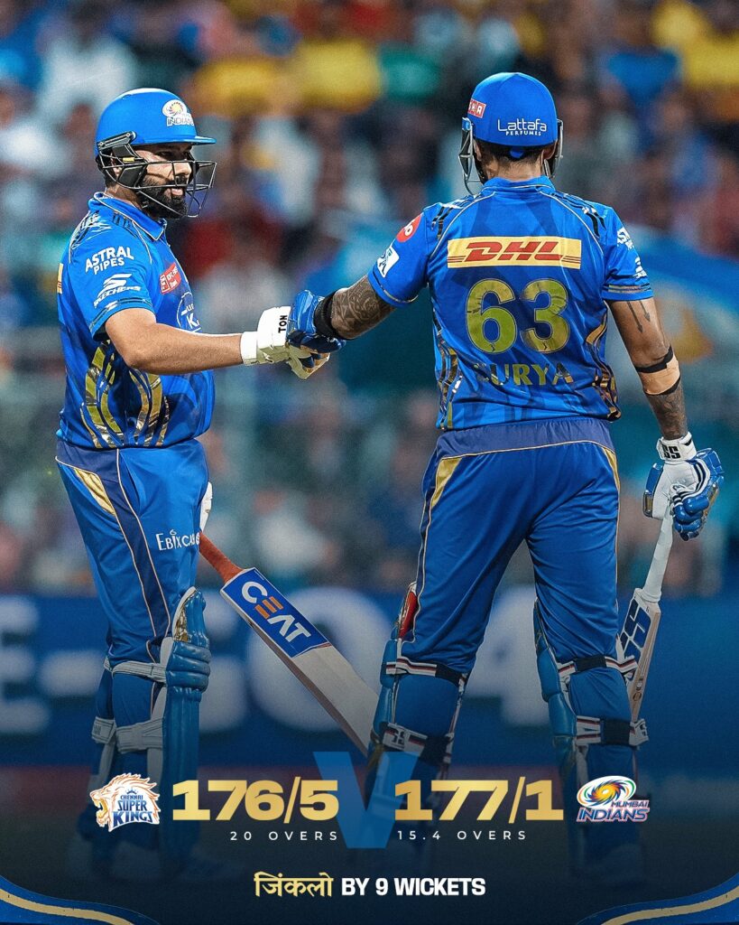 वहीं 176 रनों के लक्ष्य का पीछा करने उतरी मुंबई के सलामी बल्लेबाजों ने शानदार शुरुआत की. रोहित शर्मा और रिकल्टन ने शानदार साझेदारी की. रिकल्टन ने 24 रनों की पारी खेली और वह जडेजा का शिकार बने और आउट हो गए. इसके बाद सूर्यकुमार और रोहित शर्मा की तूफानी पारियों ने मुंबई को 9 विकेट से जीत दिलाई. रोहित ने 76 और सूर्यकुमार ने 68 रनों की पारी खेली.