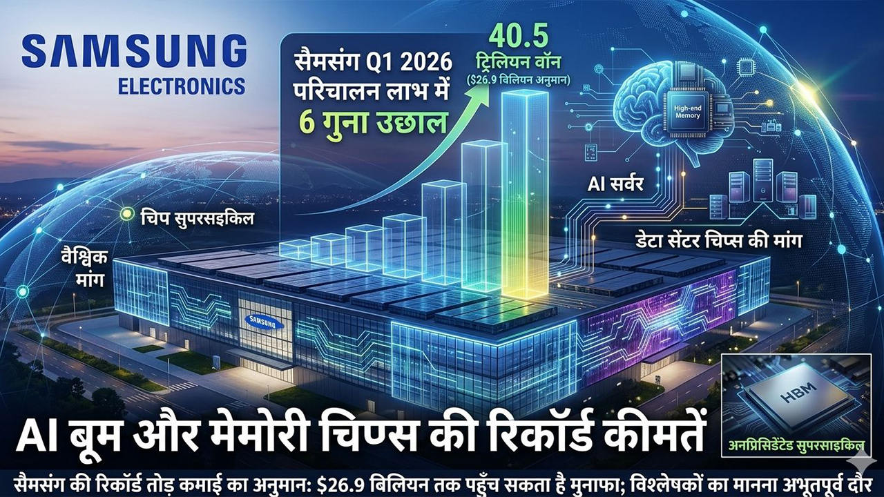 सियोल, 4 अप्रैल 2026: दुनिया की सबसे बड़ी मेमोरी चिप निर्माता कंपनी, सैमसंग इलेक्ट्रॉनिक्स (Samsung Electronics), इस साल की पहली तिमाही (जनवरी-मार्च) में अपने परिचालन लाभ (Operating Profit) में एक ऐतिहासिक वृद्धि दर्ज करने के लिए तैयार है। विशेषज्ञों का अनुमान है कि आर्टिफिशियल इंटेलिजेंस (AI) की बढ़ती मांग और चिप की कीमतों में उछाल के कारण कंपनी का मुनाफा छह गुना तक बढ़ सकता है।