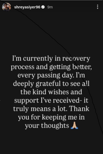 भारतीय क्रिकेटर श्रेयस अय्यर ने इंस्टाग्राम पर पोस्ट किया, “मैं अभी रिकवरी की प्रक्रिया में हूँ और हर गुजरते दिन के साथ बेहतर होता जा रहा हूँ. मुझे मिली सभी शुभकामनाओं और समर्थन के लिए मैं बहुत आभारी हूँ – यह वाकई बहुत मायने रखता है. मुझे अपने विचारों में रखने के लिए धन्यवाद.”