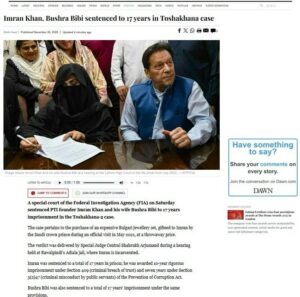 पाकिस्तान के डॉन अखबार ने रिपोर्ट किया है – “फेडरल इन्वेस्टिगेशन एजेंसी (FIA) की एक स्पेशल कोर्ट ने शनिवार को PTI के फाउंडर इमरान खान और उनकी पत्नी बुशरा बीबी को तोशाखाना-2 केस में 17 साल की जेल की सज़ा सुनाई है. यह मामला मई 2021 में एक ऑफिशियल दौरे के दौरान सऊदी क्राउन प्रिंस द्वारा इमरान को गिफ्ट किए गए एक महंगे बुल्गारी ज्वेलरी सेट को बहुत कम कीमत पर खरीदने से जुड़ा है… यह फैसला स्पेशल जज सेंट्रल शाहरुख अरजुमंद ने रावलपिंडी की अदियाला जेल में हुई सुनवाई के दौरान सुनाया, जहां इमरान कैद हैं… दोनों पर पाकिस्तानी 16.4 मिलियन रुपये का जुर्माना भी लगाया गया है.”