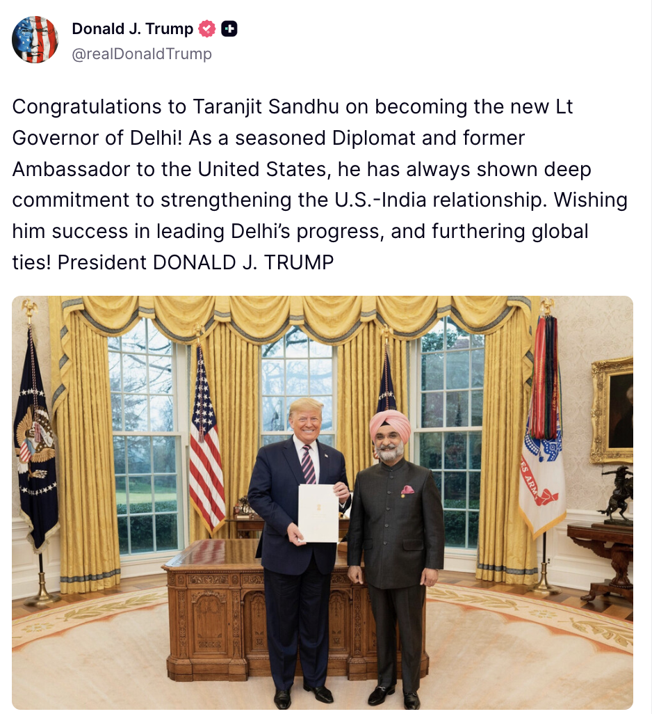 सोशल मीडिया पोस्ट में ट्रंप ने संधू को “अनुभवी राजनयिक” बताते हुए लिखा, “दिल्ली के नए उपराज्यपाल बनने पर तरणजीत संधू को बधाई। उनका नेतृत्व दिल्ली के विकास और वैश्विक साझेदारी को आगे बढ़ाएगा।”