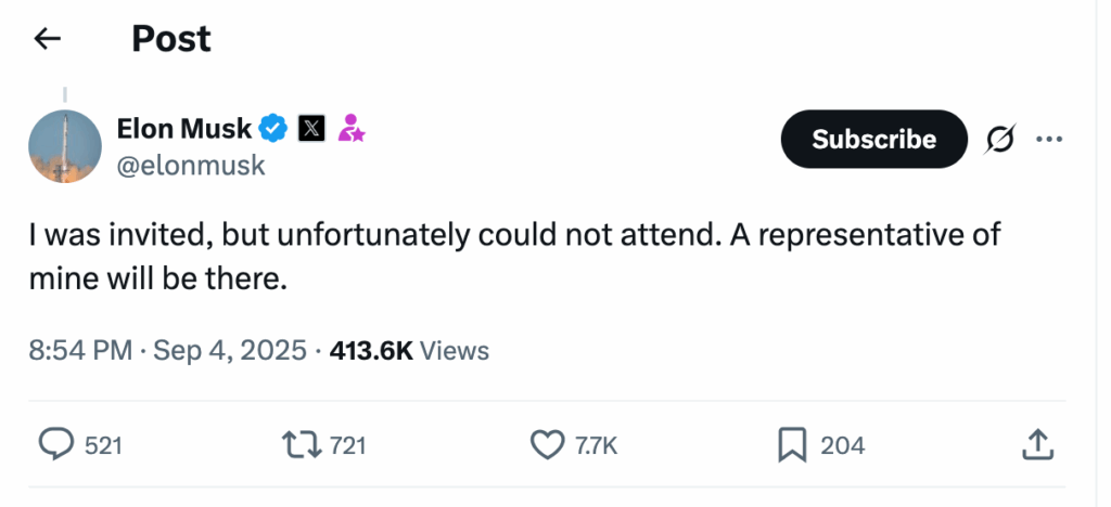 मस्क ने एक्स पर पोस्ट किया, “मुझे आमंत्रित किया गया था, लेकिन दुर्भाग्य से मैं इसमें शामिल नहीं हो सका. मेरा एक प्रतिनिधि वहाँ मौजूद रहेगा.” बाद में व्हाइट हाउस के एक अधिकारी ने उनके निमंत्रण की पुष्टि की.