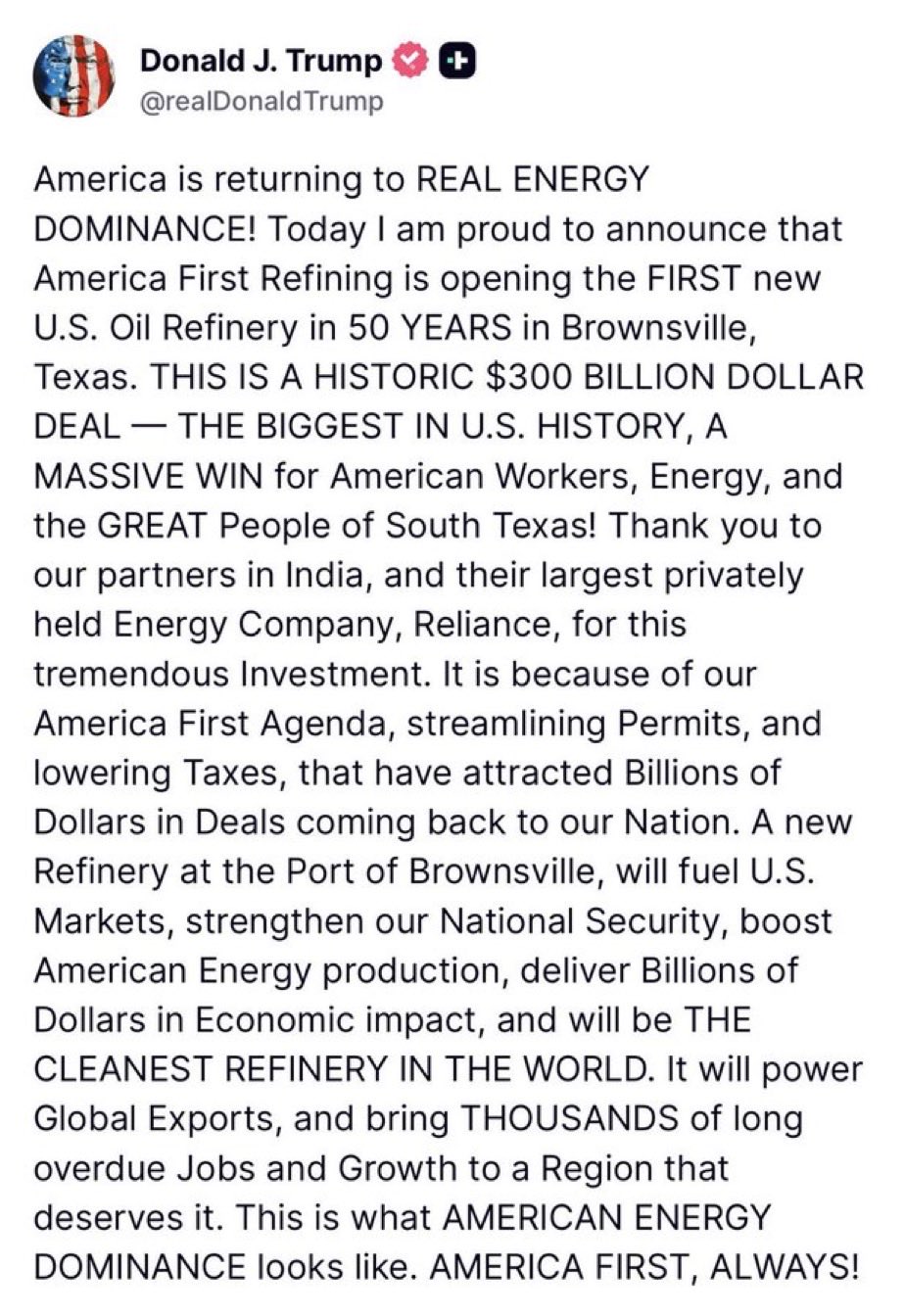 ट्रंप ने कहा कि यह नई रिफाइनरी Port of Brownsville के पास बनाई जाएगी। उनके अनुसार यह प्रोजेक्ट अमेरिका के ऊर्जा बाजार को मजबूत करेगा और देश के भीतर पेट्रोलियम उत्पादों की आपूर्ति बढ़ाएगा।