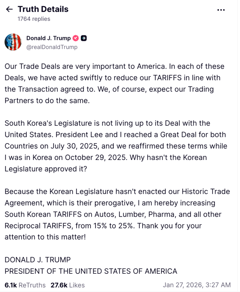 ट्रम्प ने लिखा, “क्योंकि कोरियाई विधायिका ने हमारे ऐतिहासिक व्यापार समझौते को लागू नहीं किया है, जो उनका अधिकार है, इसलिए मैं ऑटो, लकड़ी, फार्मा और अन्य सभी आपसी टैरिफ पर दक्षिण कोरियाई टैरिफ को 15% से बढ़ाकर 25% कर रहा हूँ.”