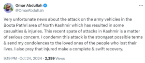 इस हमले के बाद जम्मू-कश्मीर के मुख्यमंत्री उमर अब्दुल्ला ने सोशल मीडिया पोस्ट पर ट्वीट करते हुए लिखा, “उत्तरी कश्मीर के बोटा पथरी इलाके में सेना के वाहनों पर हुए हमले की खबर बेहद दुर्भाग्यपूर्ण है, जिसके परिणामस्वरूप कुछ लोग हताहत और घायल हुए हैं. कश्मीर में हाल ही में हुए हमलों की यह श्रृंखला गंभीर चिंता का विषय है. मैं इस हमले की कड़े शब्दों में निंदा करता हूं और अपनी जान गंवाने वाले लोगों के प्रियजनों के प्रति अपनी संवेदना व्यक्त करता हूं. मैं यह भी प्रार्थना करता हूं कि घायल लोग पूरी तरह से और जल्दी ठीक हो जाएं.”