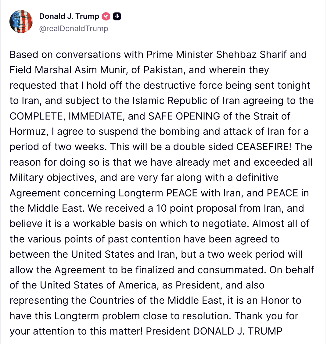 राष्ट्रपति Trump ने कहा कि इस दो-हफ्ते की अवधि का उपयोग अमेरिका व्यापक समझौते की दिशा में करेगा। उनके अनुसार, अमेरिकी सेना ने अपने प्राथमिक सैन्य उद्देश्यों को पूरा कर लिया है। उन्होंने यह भी खुलासा किया कि इरान ने एक 10-बिंदु प्रस्ताव भेजा है, जिसे उन्होंने बातचीत के लिए व्यवहार्य बताया।