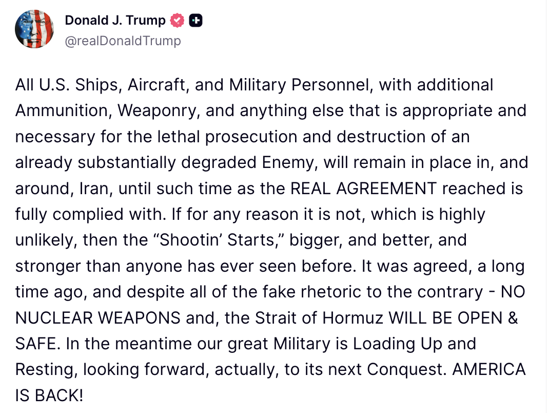 सोशल मीडिया प्लेटफॉर्म Truth Social पर पोस्ट करते हुए ट्रंप ने कहा कि अमेरिकी युद्धपोत, विमान और सैन्य कर्मी — साथ ही अतिरिक्त हथियार और गोला-बारूद — क्षेत्र में तैनात रहेंगे। उनका उद्देश्य एक “कमजोर हो चुके दुश्मन” के खिलाफ सख्त कार्रवाई सुनिश्चित करना है।